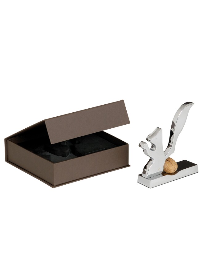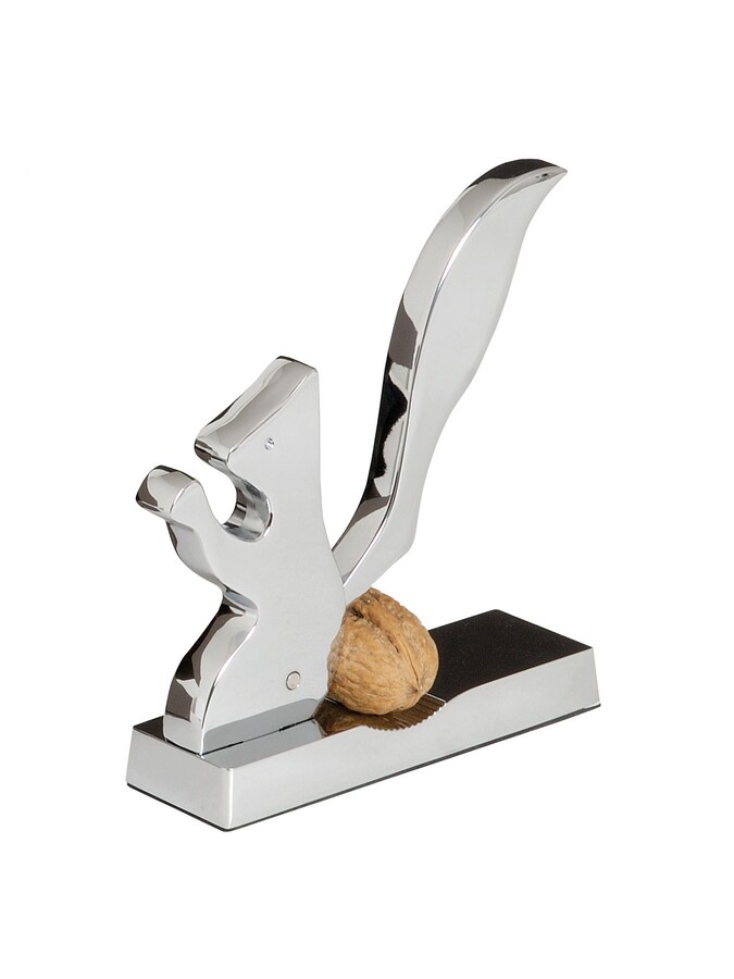 Robusto schiaccianoci cromato con base d’appoggio a forma di scoiattolo, idea regalo bomboniera.