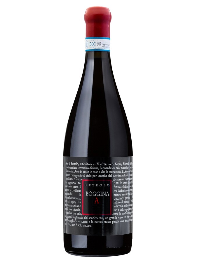 Stappare e decantare Boggina A Val d'Arno di Sopra DOC 2022 Petrolo alcune ore prima di servire a temperatura 18°C,in calice ampio Ballon.