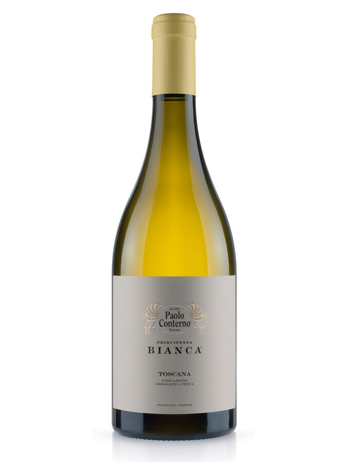 Stappare e servire Chardonnay Principessa Bianca Toscana 2018 Paolo Conterno a temperatura tra 12 - 15°C,in calice Renano.