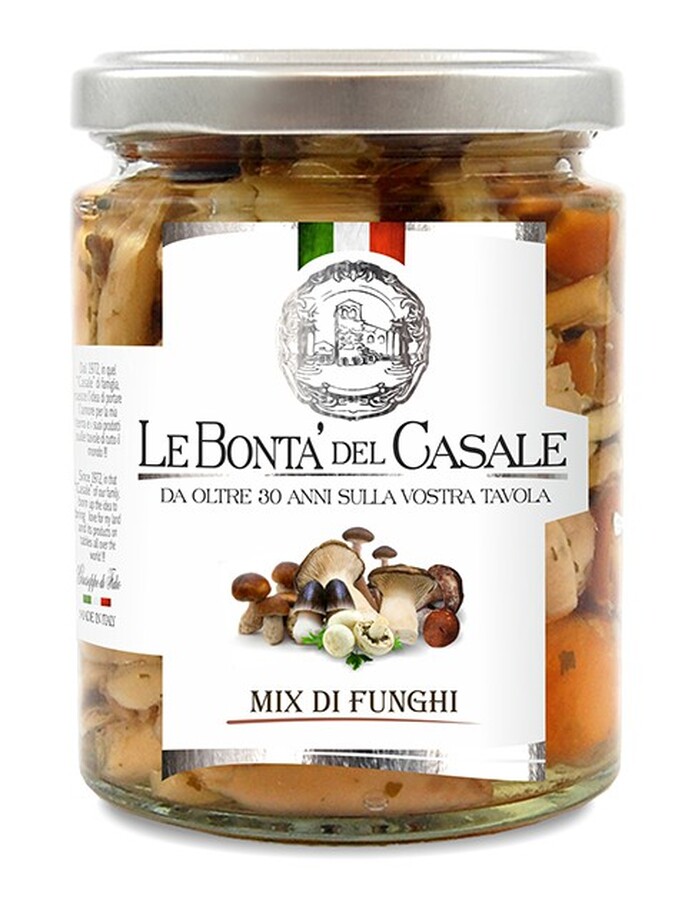 Funghi di muschio (Volvaria Volvacea), funghi nameko (Pholliota Mutabilis), funghi champignons (Agaricus Bisporus), funghi pleurotus (Pleurotus Ostreatus), funghi Stropharia (Rugoso Annulata) in proporzioni variabili (63%), olio di semi di girasole (32%), aceto di vino, sale, erbe aromatiche, spezie. Correttore dell'acidità: acido citrico; Antiossidante: acido L-ascorbico.