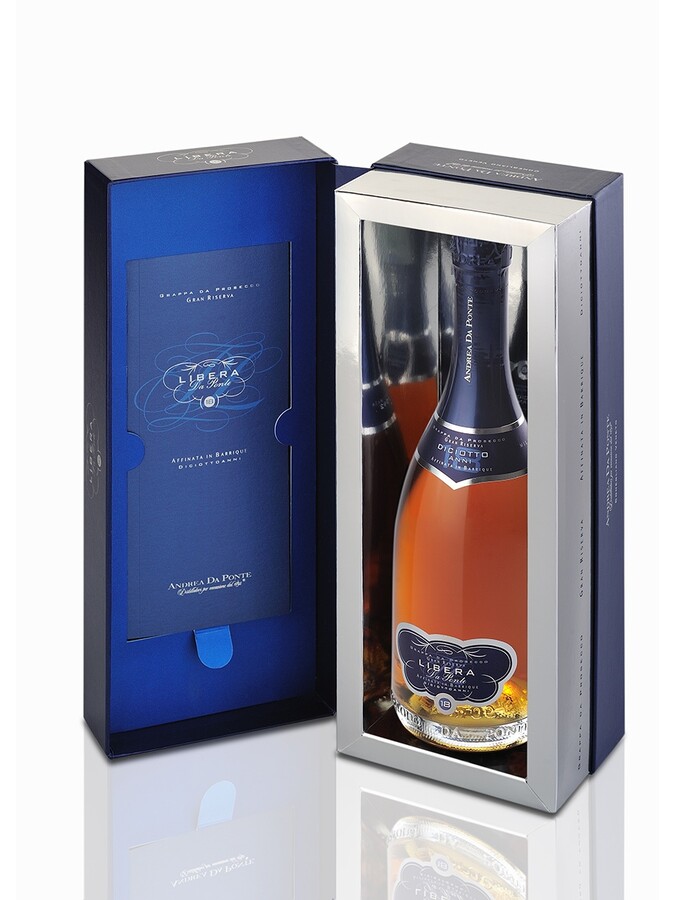 Grappa Libera Da Ponte prodotta con vinacce di Prosecco monovitigno in Valdobbiadene, caratterizzata dal color ambra carico dato da 18 anni d'invecchiamento in barrique, e il profumo intenso, un’esplosione di aromi e note ancor più amabili attraverso l’invecchiamento. Prodotto messa a Gran Riserva nel centesimo anniversario della fondazione della Distilleria.