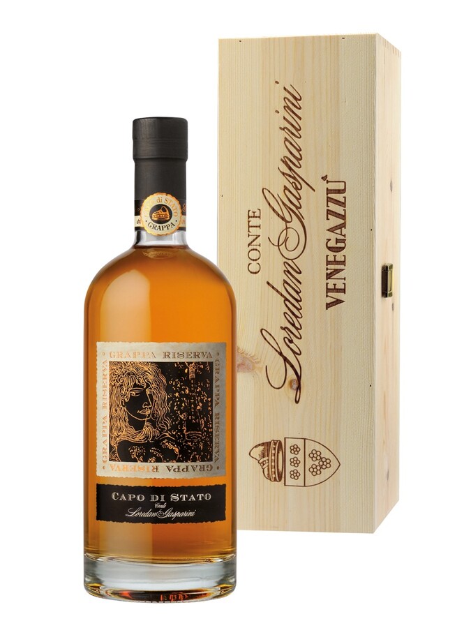 Grappa Capo di Stato Riserva invecchiata 10 anni Loredan Gasparini, ottenuta da vinacce selezionate: Cabernet Sauvignon, Cabernet Franc, Merlot e Malbech. Ottima limpidezza e pulizia, un sapore morbido ed elegante, unico e irripetibile, grazie al lungo periodo conservato in barrique, Profumo floreale, la doppia distillazione a bagnomaria permettono di conservare l'aroma inimitabile del gusto sincero ed elegante, la mandorla dolce su tutti, si associano i fiori bianchi secchi ed un finale dolce con toni suadenti del cioccolato fuso.