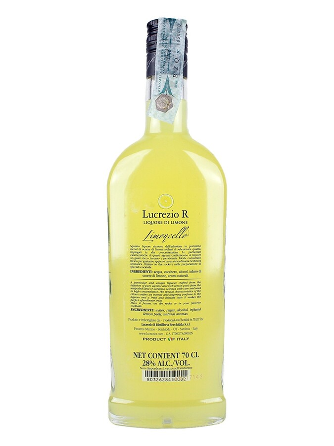 Grado alcool è di 28% vol. Servire Limoncello Classic Lucrezio R alla temperatura di 12 - 14°C in calice tulipano piccolo.