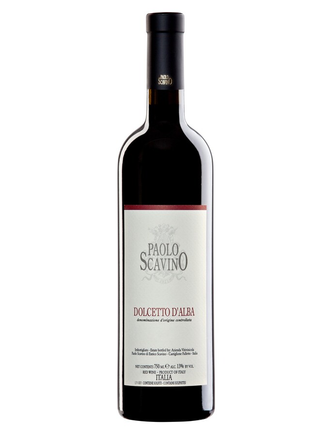 Stappare e decantare Dolcetto d'Alba DOC 2018 Paolo Scavino prima di servire a temperatura di 16°C in calice ampio Ballon.