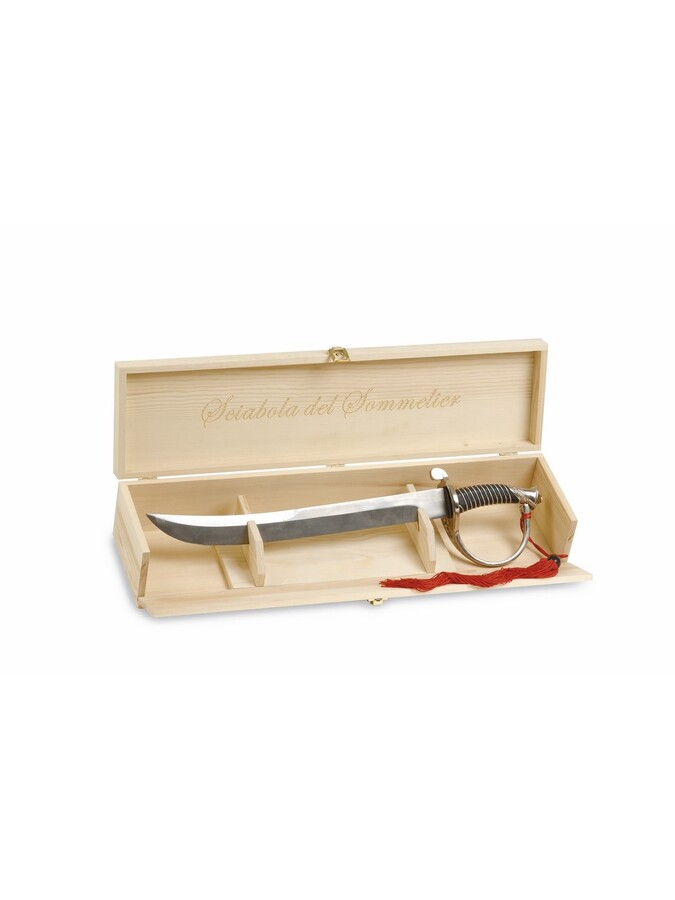 Professional Sommelier saber made of ASI 316 stainless steel, length 57cm stored in the pine wooden box. Ideal tool to professionally uncork bottles of sparkling wines, even of the highest class, from champagne to sparkling wines in general ... with a bang!