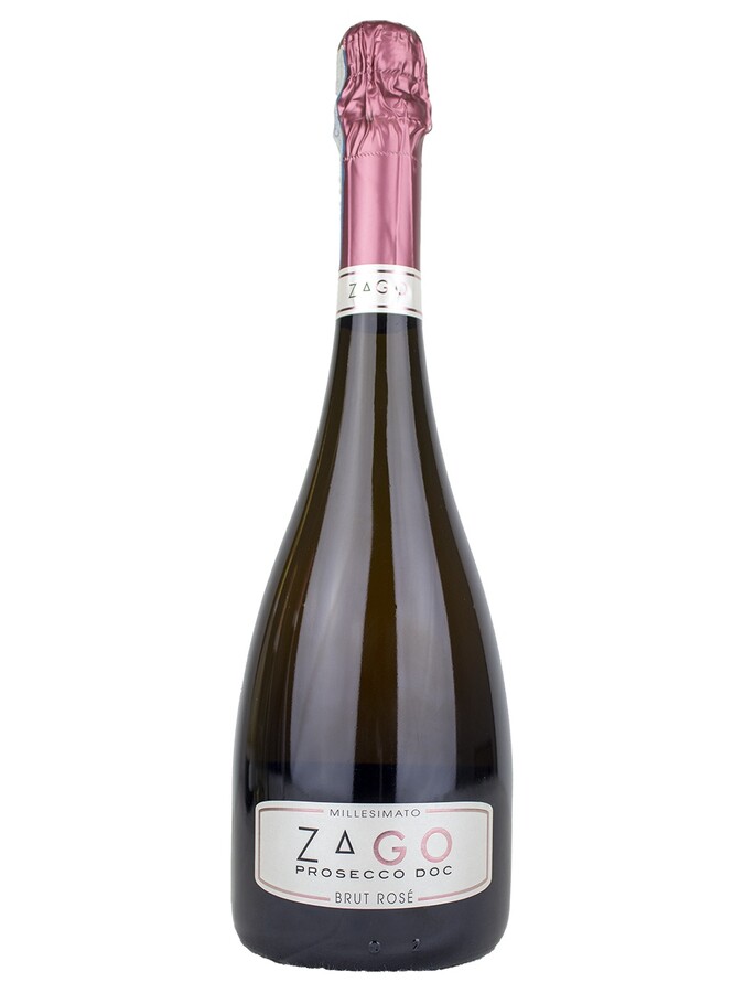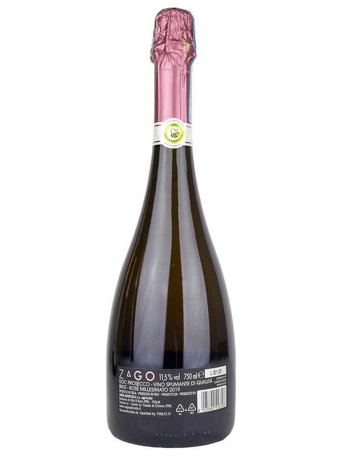 Glera with a minimum% of Pinot Noir gives a degree of Brut dryness, excellent bright pink color, lively aroma, a creamy climax on the palate. Bravo Zago.