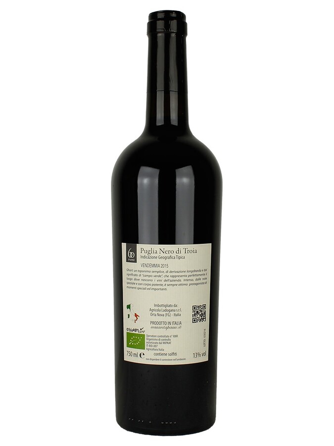 Nero di Troia 100% native grape of Puglia, the oldest of southern Italy; The grapes and takes the name of "Nero di Troia" due to its high polyphenolic charge, which gives an intense ruby color that can sometimes seem to be "black". Wine colour deep and intense ruby red, with intoxicating fragrances and well-defined, leaving you to wander with the mind by the fruit of the forest aromatic spices of cinnamon, caramel, black pepper etc.... Wine of great alcoholic power, it has rightly tannic, fresh with a pleasant ending.
