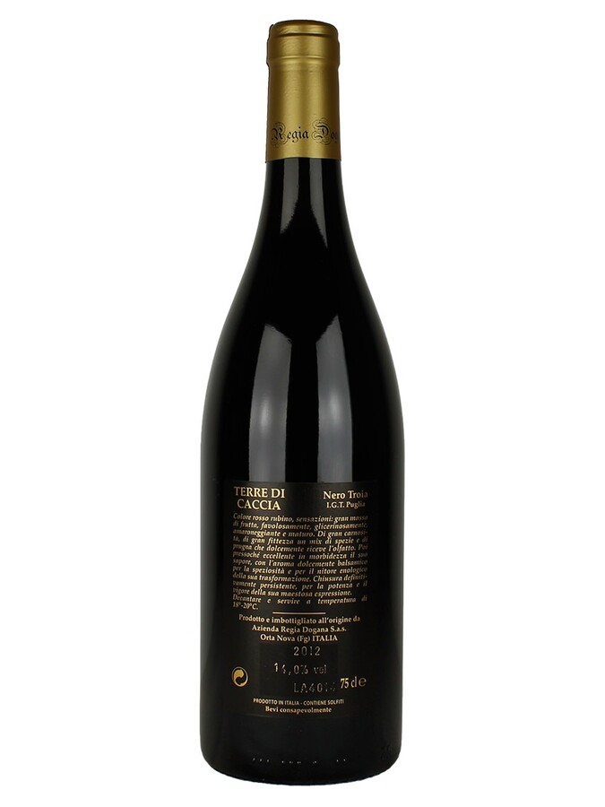 Terre di Caccia I.G.T. wine obtained from uva di troia color red ruby. Of great school, great density and a mix of spices and plum, which gently receives the sense of smell.