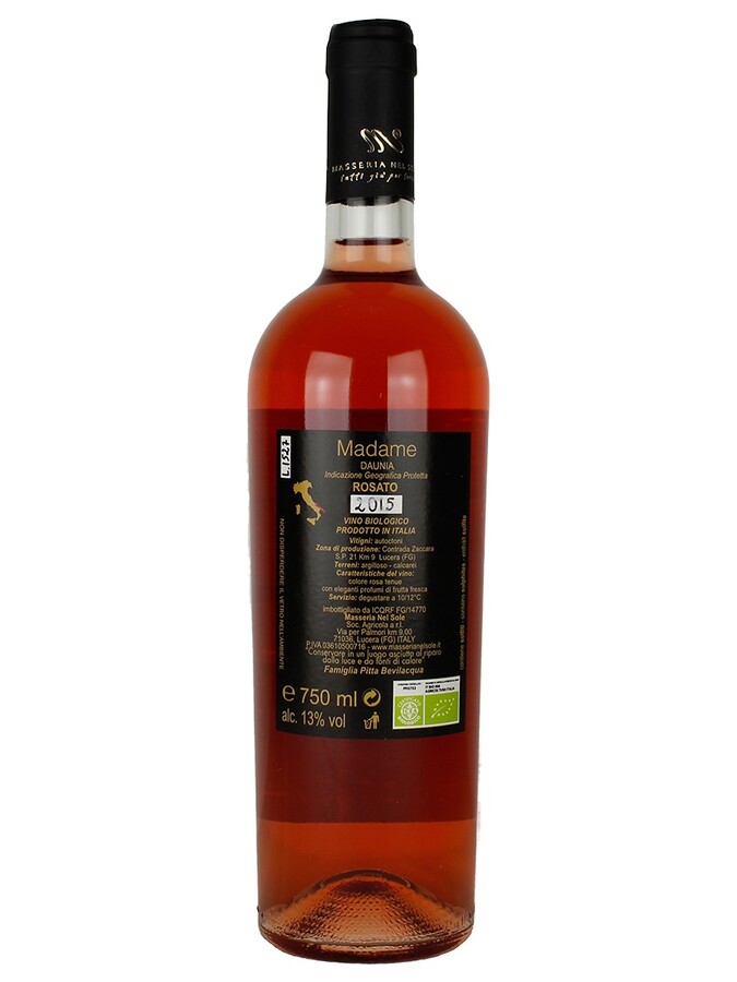 The Sommelier: The Pink “Madame” is produced from Montepulciano grapes, the color is light pink. Features of the rose “Madame” conferred by area of origin, the soil is clayey-calcareous soil gives the wine a balanced acidity and a strong flavor. Pleasantly fruity, with evident hints of cherry, on the palate it is fresh and persistent.