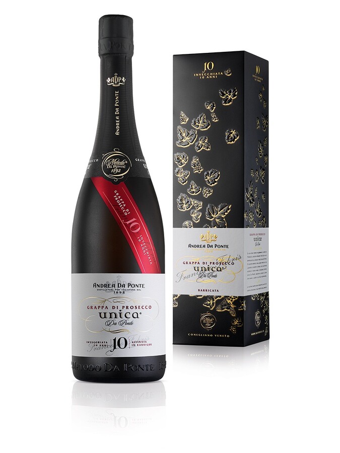 Prosecco Unica Da Ponte 10 years smooth grappa on the palate, with a pleasant aftertaste of vanilla and honey. Alcohol: 40% vol.