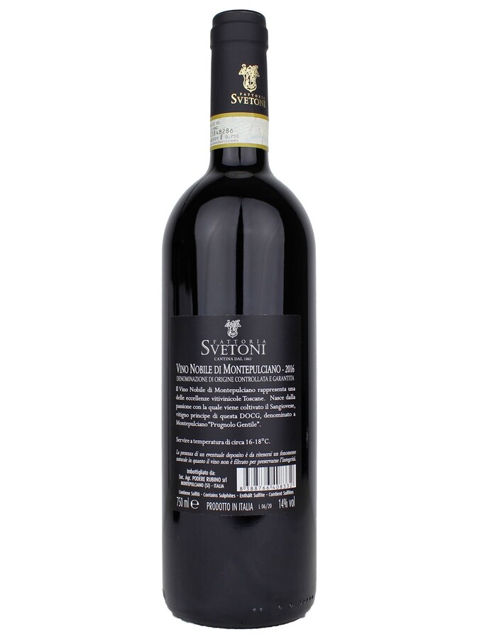 Nobile di Montepulciano Tuscany - Fattoria Svetoni, Tuscan red wine of 100% Sangiovese. Matured in French oak barrels, then bottled before release.