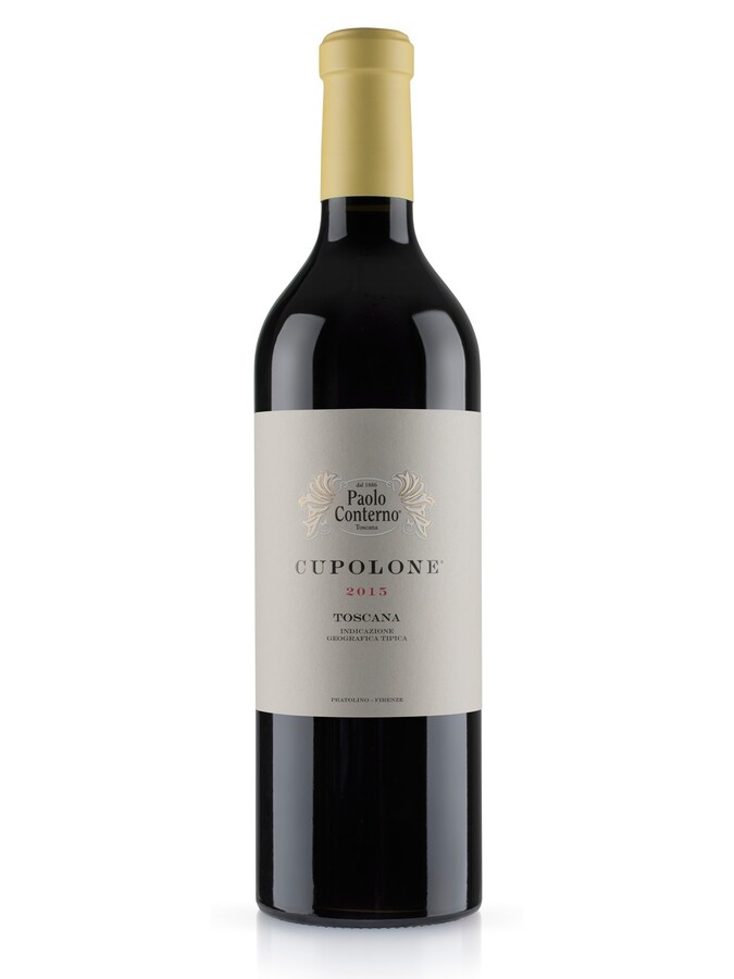 Stappare e decantare Merlot Cupolone Toscana 2015 Paolo Conterno prima di servire a temperatura tra 16 - 18°C,in calice Renano.