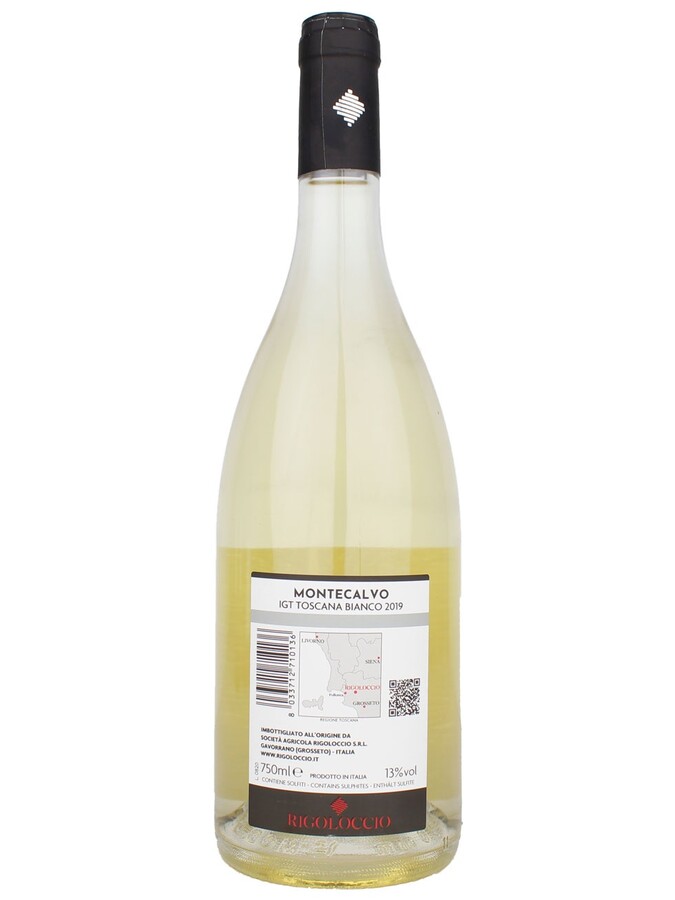 Vino bianco Toscana IGT Chardonnay - Fiano Montecalvo prodotto da Rigoloccio vino di qualità che migliora con il tempo. Forte componente minerale; banana e vaniglia leggera. In bocca è caldo, morbido buona freschezza e mineralità vino equilibrato e persistente.
