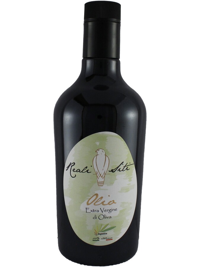 Olio Evo 5 reali Siti l’Extra vergine di Oliva Fruttato Apolio, spremitura a freddo a bassa acidità dall’immediato impatto olfattivo – gustativo, condimento essenziale per la dieta mediterranea.
