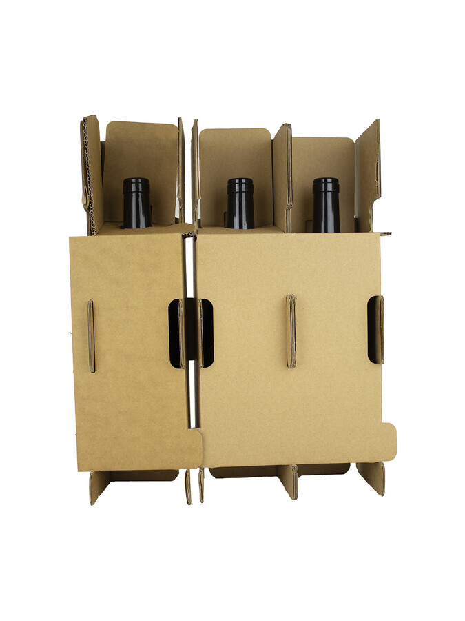 La scatola esterna è realizzata in cartone rigido doppia onda. Ogni bottiglia è protetta da un doppio sostegno che permette un bloccaggio flessibile ed elastico ad ogni singola bottiglia.