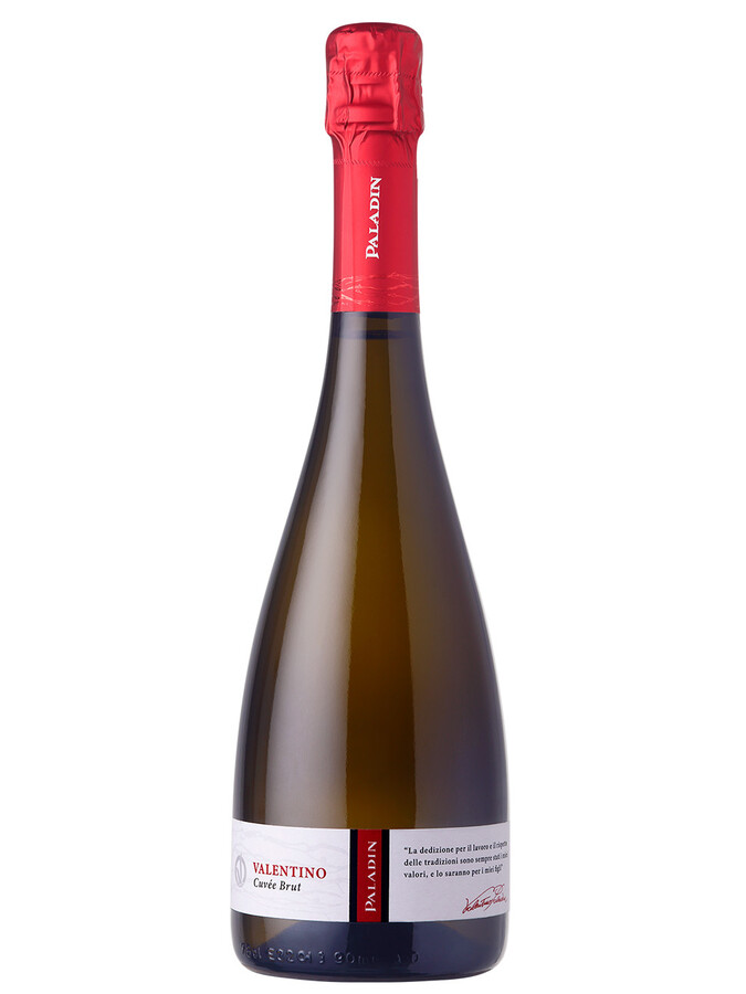 Valentino Cuvée brut Paladin eccellente spumante ottimo per aperitivi, si sposa con piatti di pesce crudo, antipasti di scampi e cappesante.