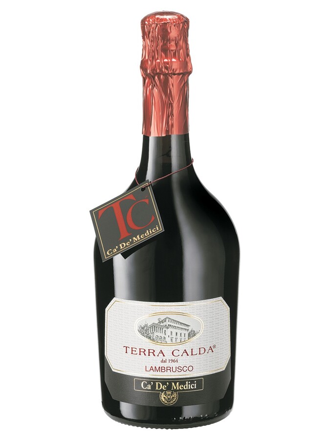 Terra Calda Cuvée Lambrusco Secco Ca' De' Medici prodotto da uve lambrusco, Cabernet, Malbo Gentile, vino di pregio. Colore rosso rubino marcato, Vino frizzante con ottima spuma poco persistente, perlage fine. Profumo ricco e fruttato, mix di frutta matura. In bocca spumeggiante, abboccato, fresco, piacevolmente beverino, nel finale buona persistenza. Ottima alcolicità 11,50% vol.