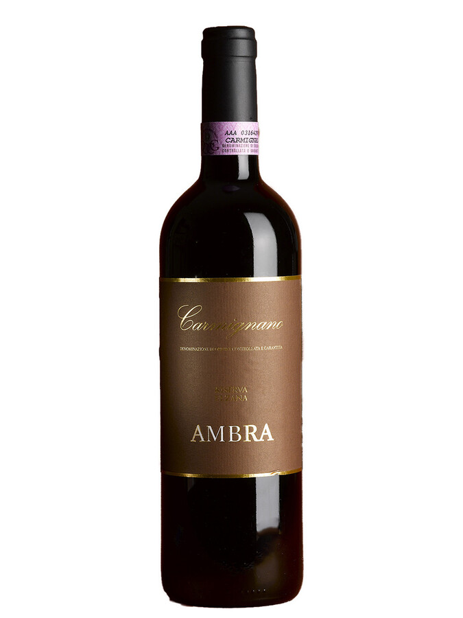 Carmignano Riserva Vigneti Elzana di Ambra, dai toni rubino scuri e riflessi granati, profumo elegante intenso di spezie. In bocca asciutto mantiene coerenza e polpa, un tannino più incisivo che sorregge la trama e la spinge a lungo.